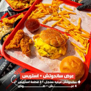 عدد 10 قطع دجاج (5كبير + 5صغير) + 10 قطع استربس + 5 طبق ارز + 3 باكت بطاطس لارج + 8 عيش + صوص جبنة كبير + كلوسلو كبير